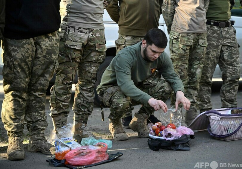 数十キロ南方の小さな村でも、前線でロシア軍と対峙(たいじ)する第59機械化旅団の兵士たちがイースターを祝うため民家の前に集まっていた。
