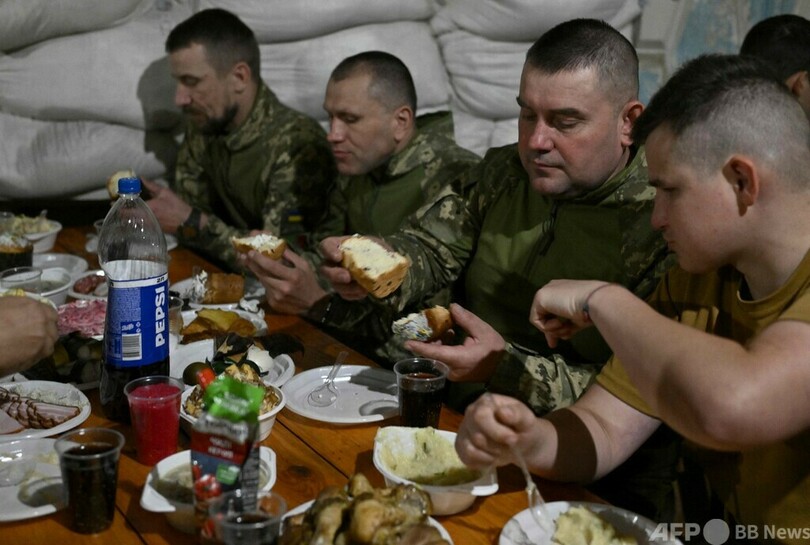 数十キロ南方の小さな村でも、前線でロシア軍と対峙(たいじ)する第59機械化旅団の兵士たちがイースターを祝うため民家の前に集まっていた。