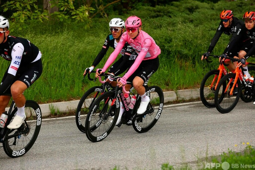 首位に立つUTE(UAE TEAM EMIRATES)のタデイ・ポガチャル(Tadej Pogacar、スロベニア)ら、タイトルを争う上位勢はメイン集団の中でフィニッシュしたため、総合争いに変動はなかった。(c)AFP