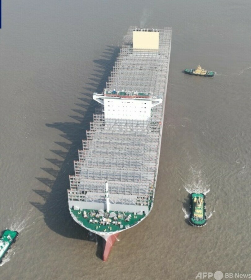中国初の2万4000 TEU級コンテナ船は中国船舶集団傘下の滬東中華造船(集団)の長興造船基地で建造され、2021年12月29日に順調にドックを出て、2022年6月22日には発注元に引き渡されました。(c)CGTN Japanese/AFPBB News