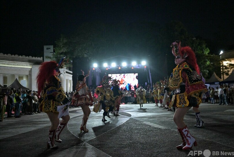 【5月22日 AFP】ベネズエラ・カラカスで開かれた「ビバ・ベネズエラ・ワールド・フェスティバル(Viva Venezuela World Festival)」でパフォーマンスを披露するボリビアの「オルロのディアブラーダ(悪魔の踊り、La Diablada de Oruro)」のダンサー。(c)AFP