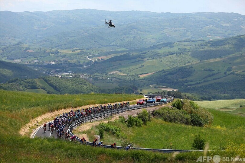 総合争いではUTE(UAE TEAM EMIRATES)のタデイ・ポガチャル(Tadej Pogacar、スロベニア)が総合首位のマリアローザ(ピンクジャージー)を維持。同2位につけるボーラ・ハンスグローエ(Bora Hansgrohe)のダニエル・マルティネス(Daniel Martinez、コロンビア)との2分40秒差、同3位につけるイネオスのゲラント・トーマス(Geraint Thomas、英国)との2分56秒差を守った。(c)AFP
