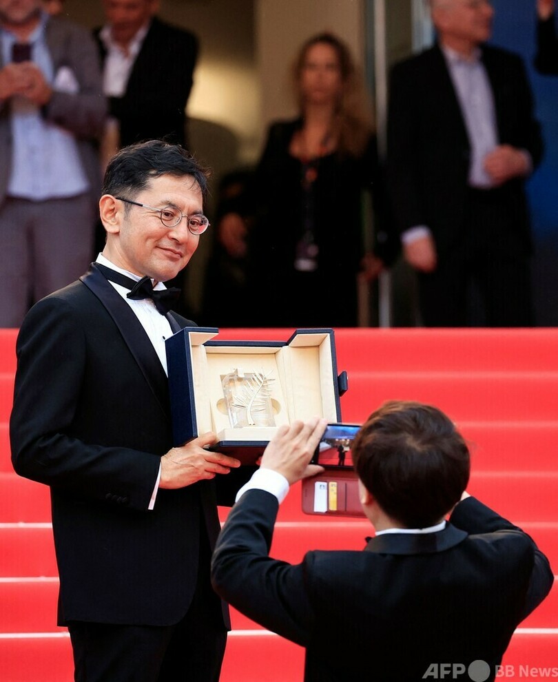 吾朗監督は、オスカー像を米国から大切に持ち帰る際にジブリの代表者はホテルのタオルにくるまなければならなかったというエピソードを披露。名誉パルムドールのトロフィーは箱に入っていて「非常にうれしく思います」とジョークを飛ばした。(c)AFP