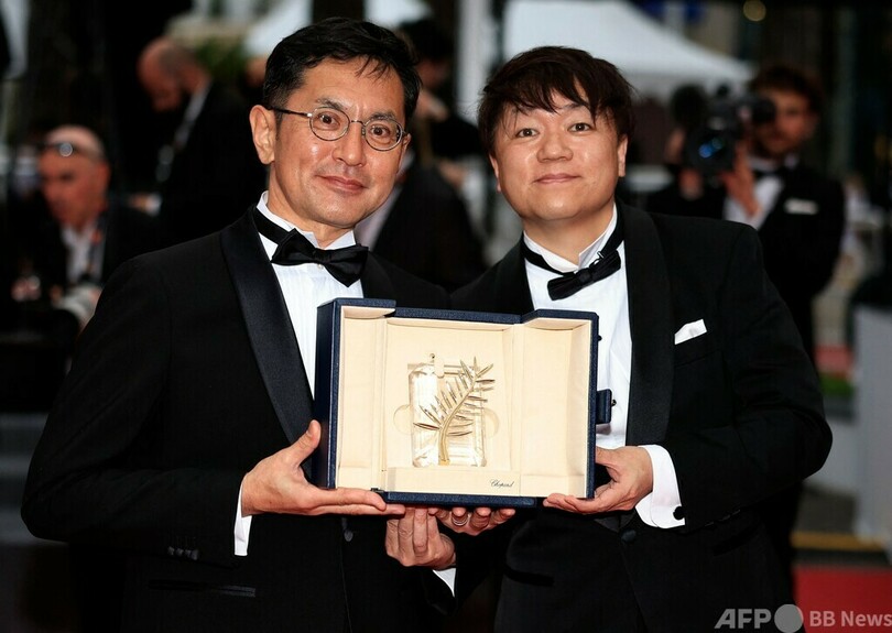 吾朗監督は、オスカー像を米国から大切に持ち帰る際にジブリの代表者はホテルのタオルにくるまなければならなかったというエピソードを披露。名誉パルムドールのトロフィーは箱に入っていて「非常にうれしく思います」とジョークを飛ばした。(c)AFP