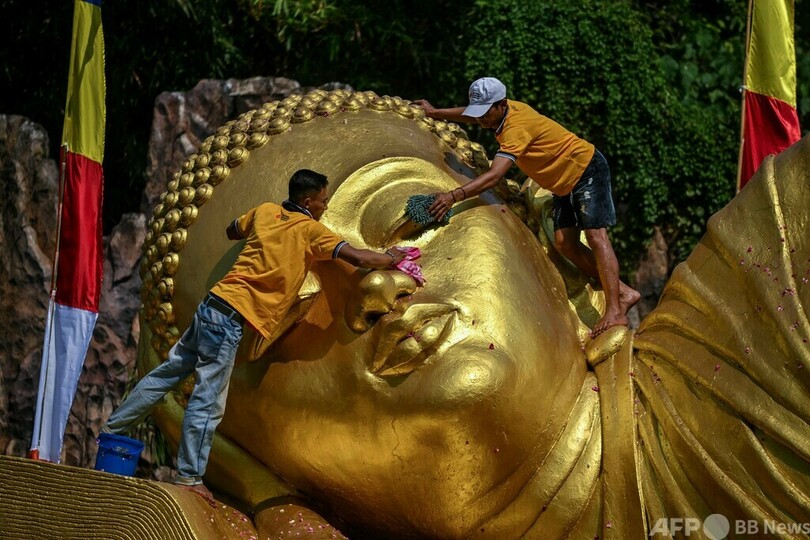 【5月28日 AFP】インドネシア・モジョケルト(Mojokerto)にあるマハビハーラマジャパヒト(Maha Vihara Mojopahit)寺院で、釈迦(しゃか、Buddha)の誕生、成道、入滅を記念するウェーサク(Vesak)祭を控え、涅槃(ねはん)像を洗う作業員。(c)AFP