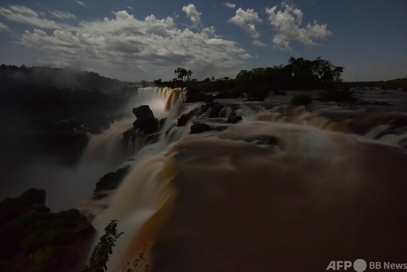 【6月4日 AFP】アルゼンチン・ミシオネス(Misiones)州プエルトイグアス(Puerto Iguazu)近くのイグアス国立公園(Iguazu National Park)で、上弦の月の光に浮かび上がるイグアスの滝(Iguazu Falls)の一部、サン・マルティン(San Martin)滝(中央)とビグア(Mbigua)滝(手前)。イグアスの滝はブラジルとアルゼンチンにまたがる。(c)AFP