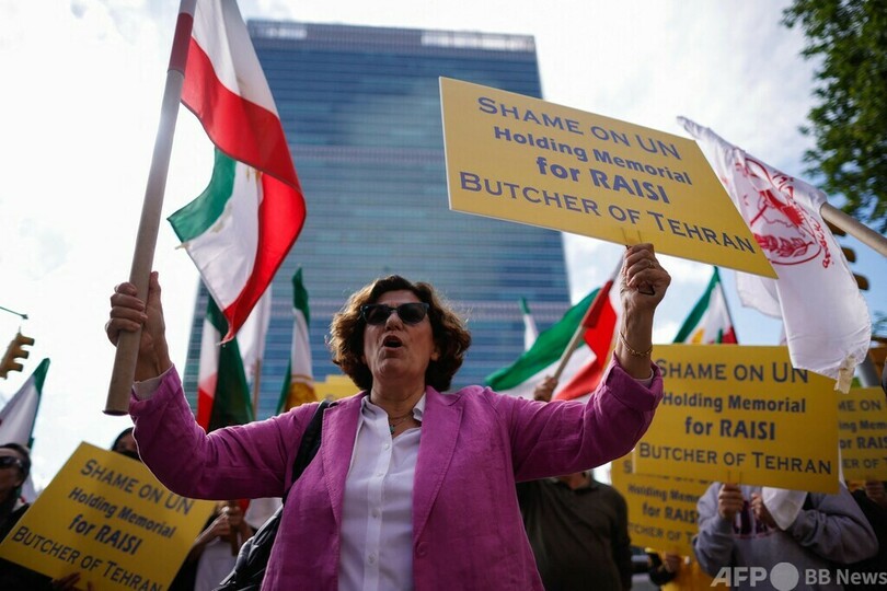 米ニューヨークの国連本部前では、イランの反体制派数十人が 「国連の恥 」とシュプレヒコールを上げた。