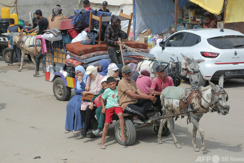 【6月7日 AFP】イスラエル軍とイスラム組織ハマス(Hamas)の戦闘が続く中、パレスチナ自治区ガザ地区(Gaza Strip)南部へのイスラエル軍の攻撃を受けてラファ(Rafah)からハンユニス(Khan Yunis)へ逃れてきた避難民。(c)AFP