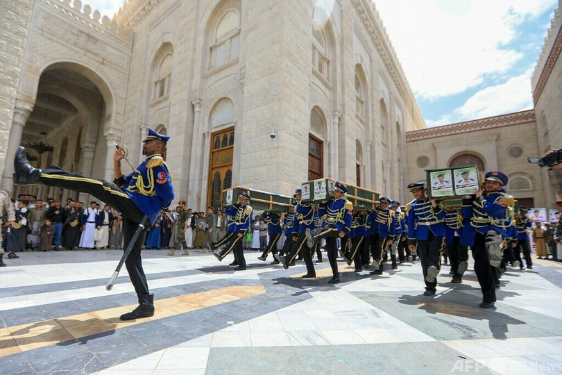 【6月13日 AFP】イエメンの親イラン武装組織フーシ派(Huthis)が支配するサヌアで行われた米英軍の攻撃による犠牲者の葬儀で、ひつぎを担ぐイエメン儀仗(ぎじょう)隊員ら。米軍によると、フーシ派の威嚇に対する米英軍による夜間の報復攻撃の後、フーシ派は無人機とミサイルを発射したという。(c)AFP