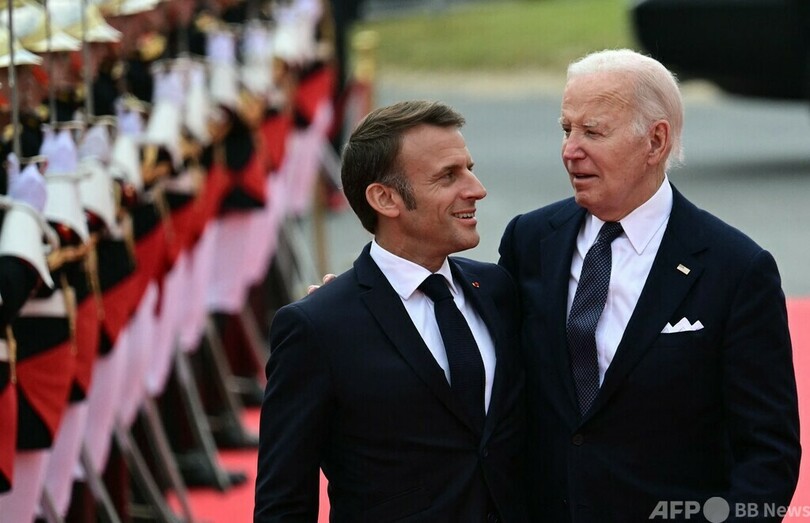マクロン氏は演説でロシアによるウクライナ侵攻に触れ、「ウクライナの人々の勇敢さに感謝する。われわれはここに立ち、ひるまない」「われわれの大陸で再び戦争が起きようとしている。歴史を塗り替えるために、力ずくで国境を変えようとする者たちとわれわれは対峙(たいじ)している」と発言。ゼレンスキー氏に向かって「今日ここにあなたがいることが、そのすべてを物語っている」と語り掛けた。
