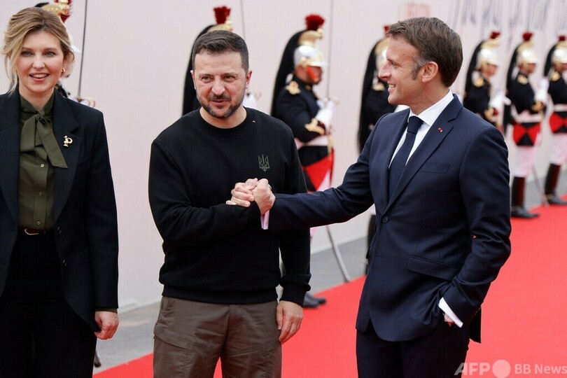 マクロン氏は演説でロシアによるウクライナ侵攻に触れ、「ウクライナの人々の勇敢さに感謝する。われわれはここに立ち、ひるまない」「われわれの大陸で再び戦争が起きようとしている。歴史を塗り替えるために、力ずくで国境を変えようとする者たちとわれわれは対峙(たいじ)している」と発言。ゼレンスキー氏に向かって「今日ここにあなたがいることが、そのすべてを物語っている」と語り掛けた。