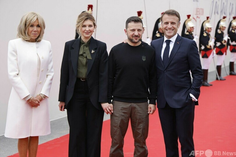 マクロン氏は演説でロシアによるウクライナ侵攻に触れ、「ウクライナの人々の勇敢さに感謝する。われわれはここに立ち、ひるまない」「われわれの大陸で再び戦争が起きようとしている。歴史を塗り替えるために、力ずくで国境を変えようとする者たちとわれわれは対峙(たいじ)している」と発言。ゼレンスキー氏に向かって「今日ここにあなたがいることが、そのすべてを物語っている」と語り掛けた。