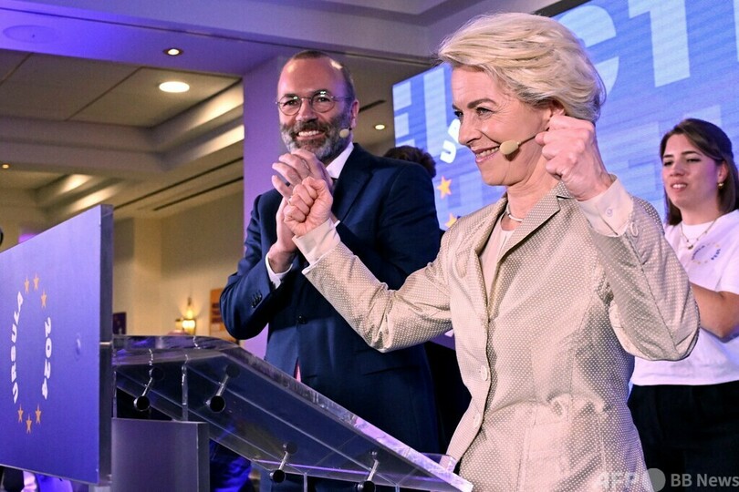 欧州委員長職の続投に意欲を見せるウルズラ・フォンデアライエン(Ursula von der Leyen)氏は、支持母体のEPPについて「私たちは安定の要」だと述べ、「他の会派と共に極左・極右に対抗するとりでを築き、そうした勢力を阻止する」と訴えた。(c)AFP/Max Delany, with Stuart Williams in Paris and Hui Min Neo in Berlin