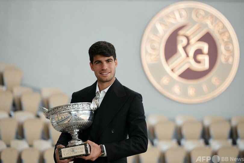 【6月11日 AFP】全仏オープンテニス(French Open 2024)の男子シングルスで初優勝を果たしたカルロス・アルカラス(Carlos Alcaraz、スペイン)が、優勝から一夜明けた10日、大会の会場内でトロフィーを手に記念撮影に臨んだ。