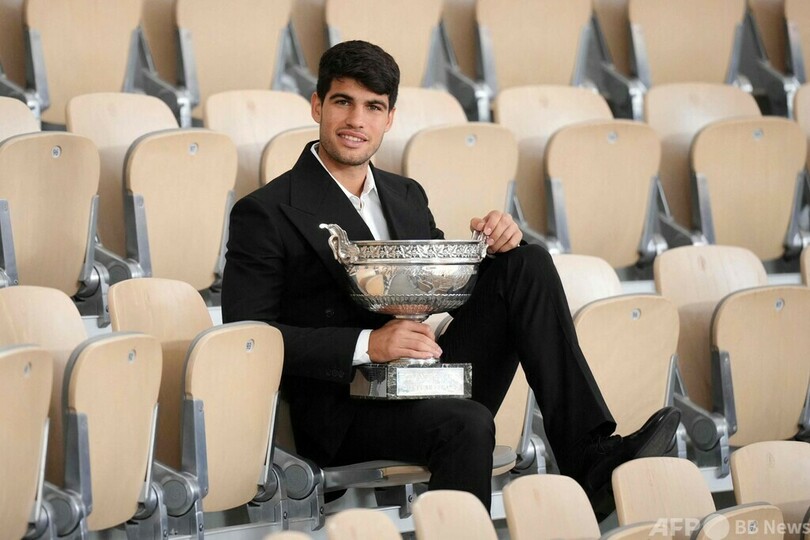 【6月11日 AFP】全仏オープンテニス(French Open 2024)の男子シングルスで初優勝を果たしたカルロス・アルカラス(Carlos Alcaraz、スペイン)が、優勝から一夜明けた10日、大会の会場内でトロフィーを手に記念撮影に臨んだ。