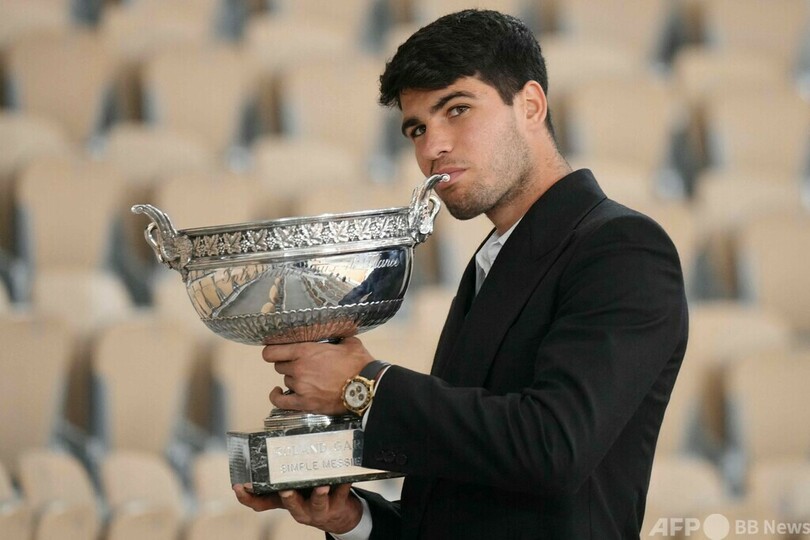【6月11日 AFP】全仏オープンテニス(French Open 2024)の男子シングルスで初優勝を果たしたカルロス・アルカラス(Carlos Alcaraz、スペイン)が、優勝から一夜明けた10日、大会の会場内でトロフィーを手に記念撮影に臨んだ。