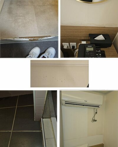 ベッドの枕元の壁紙は、液体や湿気によって黄色く変色している。一方の壁面には、過去の宿泊客が蚊数十匹を殺したように、血痕や蚊の死体などが入り混じった跡が残っている。