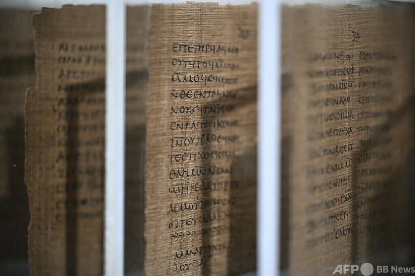 1950年代にエジプトの農業従事者によって発見された。パピルス紙の両面にコプト語で書かれ、現在はプレキシガラスに挟んで保存されている。巻物の片面に文字が書かれているのが一般的だった当時の筆記技術の進歩を示している。(c)AFP