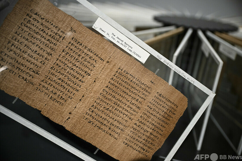 1950年代にエジプトの農業従事者によって発見された。パピルス紙の両面にコプト語で書かれ、現在はプレキシガラスに挟んで保存されている。巻物の片面に文字が書かれているのが一般的だった当時の筆記技術の進歩を示している。(c)AFP