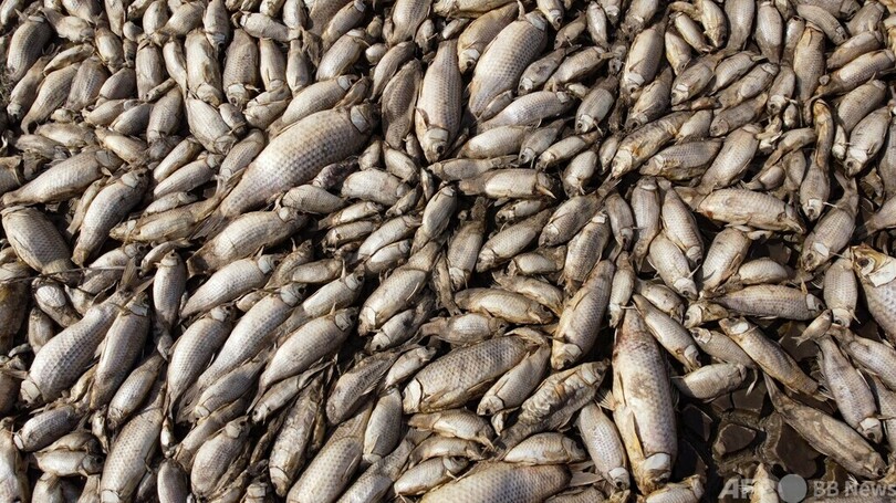 干上がってひび割れた湖底に魚の死骸が目立つようになったのは約1週間前。病気リスクへの懸念から、12日には死骸の回収作業が行われた。周囲には悪臭が漂っている。