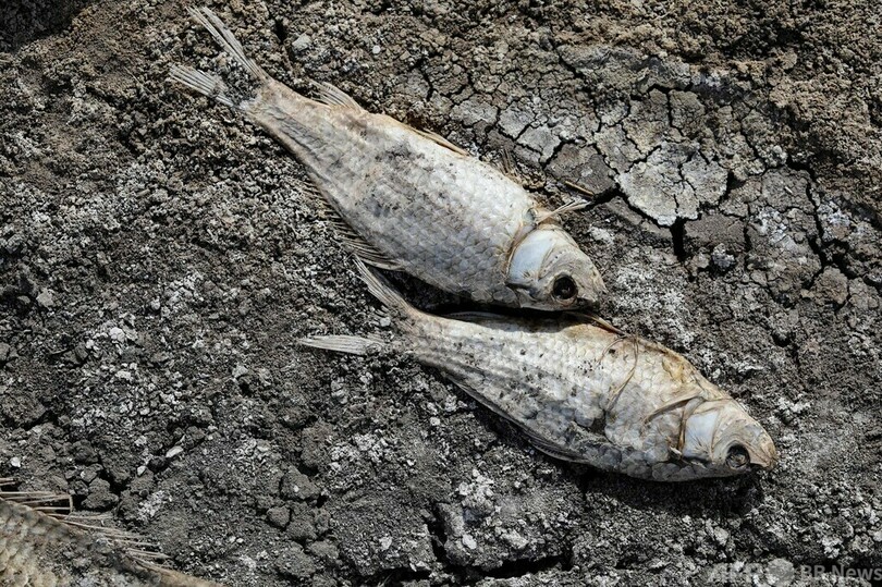 干上がってひび割れた湖底に魚の死骸が目立つようになったのは約1週間前。病気リスクへの懸念から、12日には死骸の回収作業が行われた。周囲には悪臭が漂っている。