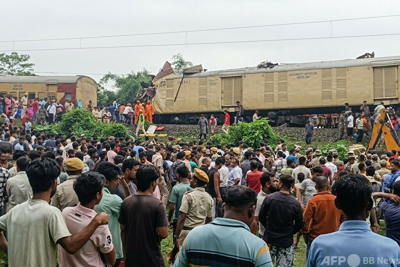 【6月17日 AFP】(写真追加)インドの西ベンガル(West Bengal)州で17日、急行列車に貨物列車が衝突し、客車3両が脱線して少なくとも7人が死亡した。