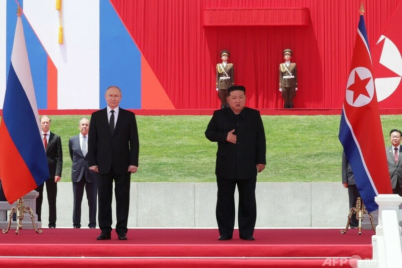 【6月20日 AFP】ロシアのウラジーミル・プーチン(Vladimir Putin)大統領と北朝鮮の金正恩(キム・ジョンウン、Kim Jong Un)朝鮮労働党総書記は19日、平壌で「包括的戦略パートナーシップ条約」に署名後、共同記者発表に臨んだ。金氏はウクライナ侵攻を続けるロシアを「全面的に支持」すると表明。プーチン氏は、条約には一方が軍事攻撃を受けた場合の「相互支援」が定められていると強調した。