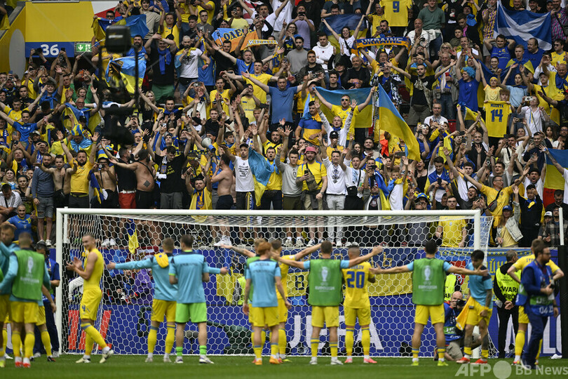 ルーマニアとの初戦では0-3の完敗を喫したが、この日は後半の早い時間帯にミコラ・シャパレンコ(Mykola Shaparenko)の得点で追いつくと、途中出場のロマン・ヤレムチュク(Roman Yaremchuk)が決勝点を決めた。選手は涙を流して勝利を喜び、試合後にはウォロディミル・ゼレンスキー(Volodymyr Zelensky)大統領から祝福のメッセージが届いた。(c)AFP/Kieran CANNING