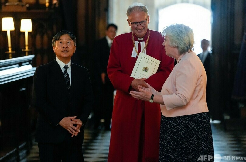 【6月28日 AFP】英国を訪問中の天皇陛下は27日、ロンドン西郊ウィンザー城(Windsor Castle)の聖ジョージ礼拝堂(St George's Chapel)を訪れ、エリザベス女王(Queen Elizabeth II)の墓に供花された。