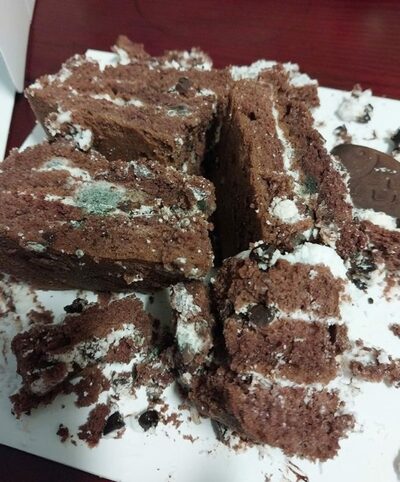 女性が1人で無理やりケーキを食べていると、急に変な味がした。ケーキを切って確認すると、中に暗い緑色のカビが生えていた。それも一部ではなく全体に広がっていた。