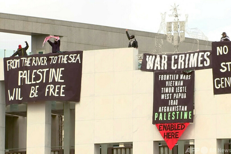 【7月4日 AFP】オーストラリアの首都キャンベラで4日、パレスチナ自治区ガザ地区(Gaza Strip)での武力衝突に反対を表明するグループが、連邦議会の壁をよじ登り、「パレスチナは解放される」などと書かれた横断幕を掲げた。また、昨年から続くガザでの紛争に加担しているとして、アンソニー・アルバニージー(Anthony Albanese)首相を非難した。