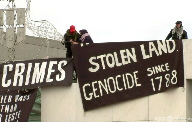 【7月4日 AFP】オーストラリアの首都キャンベラで4日、パレスチナ自治区ガザ地区(Gaza Strip)での武力衝突に反対を表明するグループが、連邦議会の壁をよじ登り、「パレスチナは解放される」などと書かれた横断幕を掲げた。また、昨年から続くガザでの紛争に加担しているとして、アンソニー・アルバニージー(Anthony Albanese)首相を非難した。
