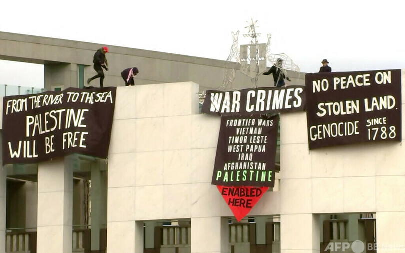 【7月4日 AFP】オーストラリアの首都キャンベラで4日、パレスチナ自治区ガザ地区(Gaza Strip)での武力衝突に反対を表明するグループが、連邦議会の壁をよじ登り、「パレスチナは解放される」などと書かれた横断幕を掲げた。また、昨年から続くガザでの紛争に加担しているとして、アンソニー・アルバニージー(Anthony Albanese)首相を非難した。