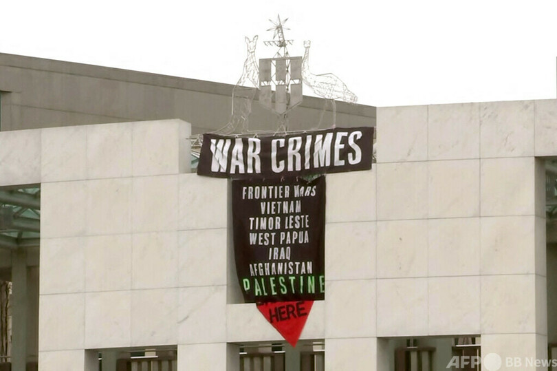 【7月4日 AFP】オーストラリアの首都キャンベラで4日、パレスチナ自治区ガザ地区(Gaza Strip)での武力衝突に反対を表明するグループが、連邦議会の壁をよじ登り、「パレスチナは解放される」などと書かれた横断幕を掲げた。また、昨年から続くガザでの紛争に加担しているとして、アンソニー・アルバニージー(Anthony Albanese)首相を非難した。