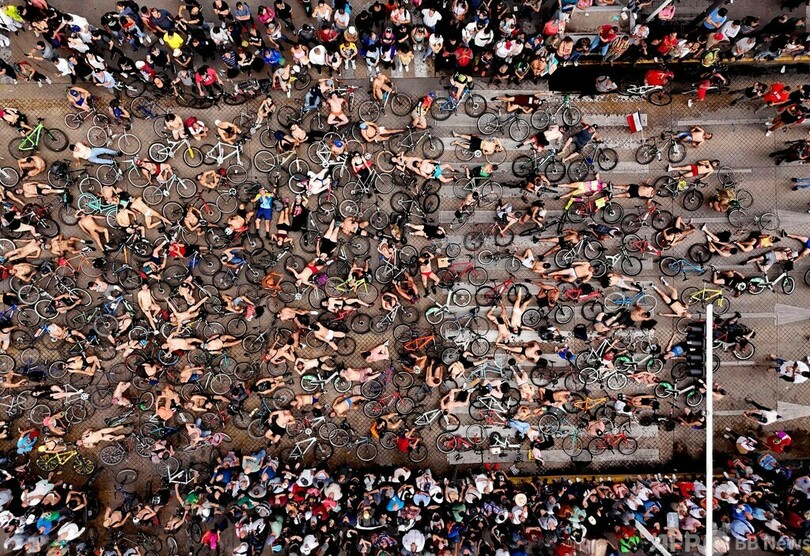 【7月9日 AFP】裸で自転車に乗るイベント「ワールド・ネーキッド・バイク・ライド(World Naked Bike Ride)」に参加した人々を捉えた空撮写真。メキシコ・ハリスコ(Jalisco)州グアダラハラ(Guadalajara)で。この催しは自転車利用者の傷つきやすさを可視化し、節度のない自動車利用と石油依存を周囲に意識させるとともに、代替交通手段を勧めている。(c)AFP