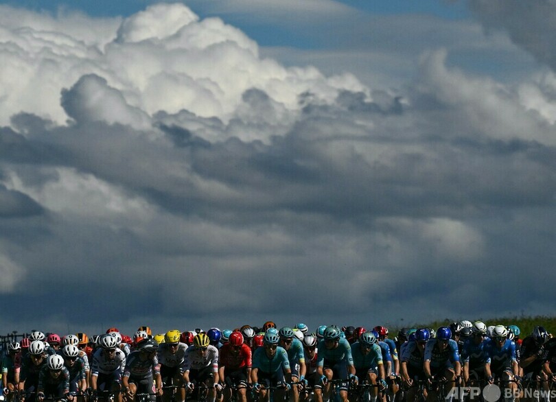 UTE(UAE TEAM EMIRATES)のタデイ・ポガチャル(Tadej Pogacar、スロベニア)は前日からの総合首位の座を守り、同2位につけるスーダル・クイックステップ(Soudal Quick-Step)のレムコ・エベネプール(Remco Evenepoel、ベルギー)との45秒差を維持。同3位にはチーム・ビスマ・リースアバイク(Team Visma | Lease a Bike)の昨年王者ヨナス・ヴィンゲゴー(Jonas Vingegaard、デンマーク)が続いている。(c)AFP