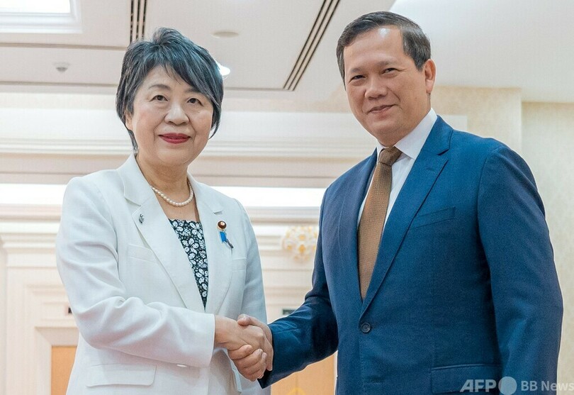 上川外相は、プノンペンの平和宮殿(Peace Palace、首相府)でフン・マネット(Hun Manet)首相を表敬訪問したほか、前首相のフン・セン(Hun Sen)上院議長とも面会した。(c)AFP