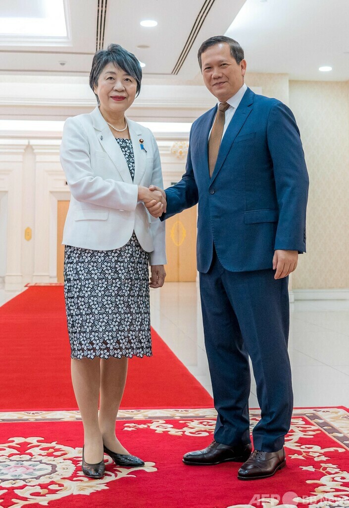 上川外相は、プノンペンの平和宮殿(Peace Palace、首相府)でフン・マネット(Hun Manet)首相を表敬訪問したほか、前首相のフン・セン(Hun Sen)上院議長とも面会した。(c)AFP