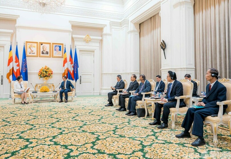 上川外相は、プノンペンの平和宮殿(Peace Palace、首相府)でフン・マネット(Hun Manet)首相を表敬訪問したほか、前首相のフン・セン(Hun Sen)上院議長とも面会した。(c)AFP