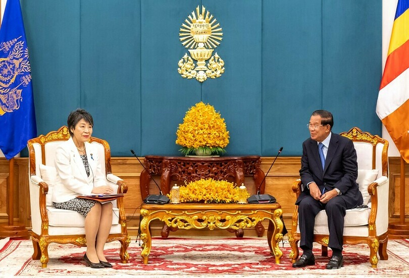 上川外相は、プノンペンの平和宮殿(Peace Palace、首相府)でフン・マネット(Hun Manet)首相を表敬訪問したほか、前首相のフン・セン(Hun Sen)上院議長とも面会した。(c)AFP