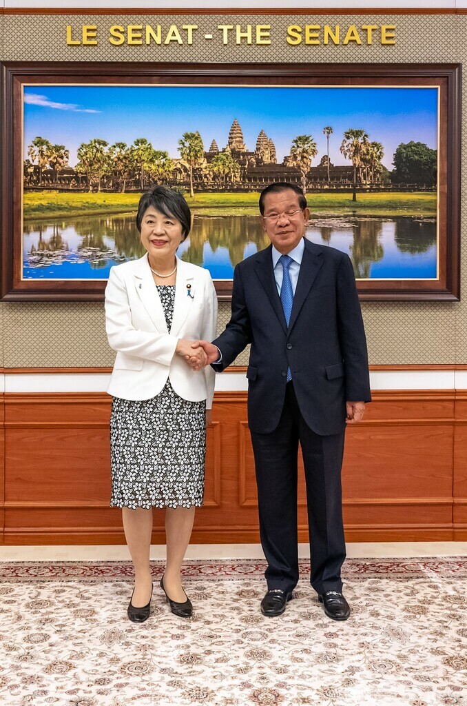 上川外相は、プノンペンの平和宮殿(Peace Palace、首相府)でフン・マネット(Hun Manet)首相を表敬訪問したほか、前首相のフン・セン(Hun Sen)上院議長とも面会した。(c)AFP