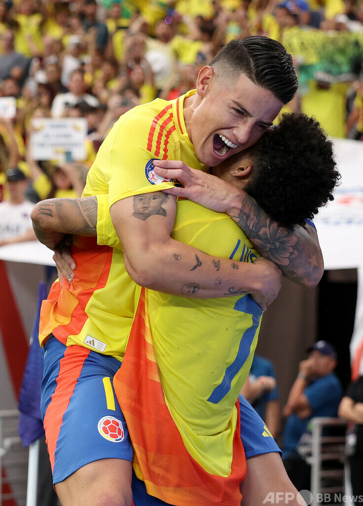 同日開催のもう1試合では、コロンビアが5‐0でパナマに圧勝して勝ち上がりを決めた。コロンビアのハメス・ロドリゲス(James Rodriguez)は、PKからの1ゴールに加えて2アシストの活躍を見せた。(c)AFP