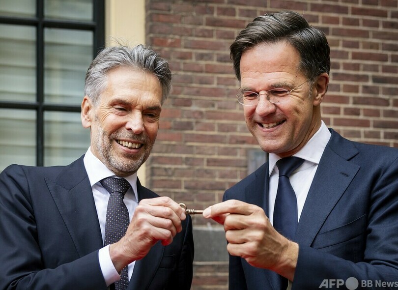 【7月13日 AFP】オランダ首相の引き継ぎ式を終え、自転車に乗ってハーグ(The Hague)の首相官邸を後にするマルク・ルッテ(Mark Rutte)前首相(左)と、手を振って見送るディック・シューフ(Dick Schoof)新首相(右端)。元情報機関トップのシューフ氏は右派連立内閣を率い、これまでで最も厳格な移民政策に取り組むとしている。(c)AFP