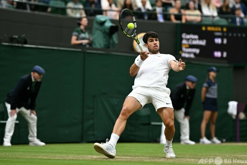 【7月10日 AFP】テニス、ウィンブルドン選手権(The Championships Wimbledon 2024)は9日、男子シングルス準々決勝が行われ、大会連覇を狙う第3シードのカルロス・アルカラス(Carlos Alcaraz、スペイン)は5-7、6-4、6-2、6-2で第12シードのトミー・ポール(Tommy Paul、米国)を下し、準決勝に進出した。