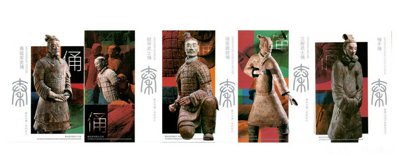 中国郵政は1983年6月30日に初めて切手4枚と小型シート1枚から成る「秦始皇帝陵兵馬俑」特別切手を発行し、図案は「群俑」「埴輪」「兵馬俑」「兵馬俑坑」で、小型シートの図案は「牽馬俑」でした。