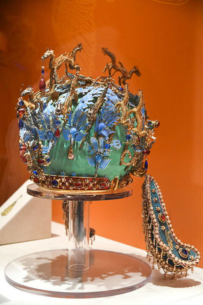 十二龍九鳳冠は孝靖皇后の随葬器物箱の中に収められていたもので、十二龍九鳳が飾られた皇后の礼装用の冠で、勅命を受けるときや寺院への参拝、宮廷の集まりの際に着用します。ひすいをちりばめて作られた十二龍九鳳冠は、当時の最高レベルの宝飾品はめ込みや金加工などの技術を表しています。