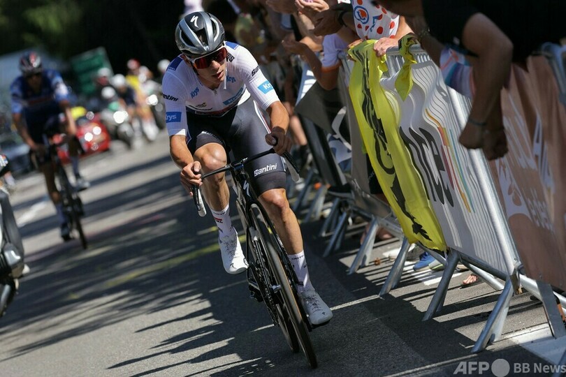 3人の中では総合3位につけるスーダル・クイックステップ(Soudal Quick-Step)のレムコ・エベネプール(Remco Evenepoel、ベルギー)が約10秒先行してゴールした。(c)AFP/Damian MCCALL