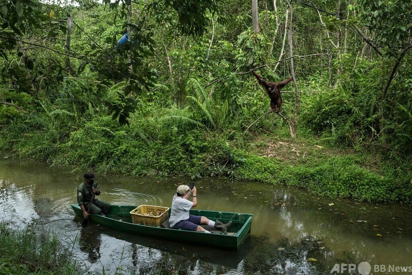 【7月28日 AFP】インドネシア・東カリマンタン(East Kalimantan)州サンボジャ(Samboja)にあるオランウータンのリハビリ施設「サンボジャ・レスタリ(Samboja Lestari Orangutan Rehabilitation Center)」にボートで餌を届けにきたスタッフら。この保護区は川に囲まれた島で、動物保護団体「ボルネオ・オランウータン・サバイバル(Borneo Orangutan Survival 、BOS)・ファウンデーション」が運営している。(c)AFP