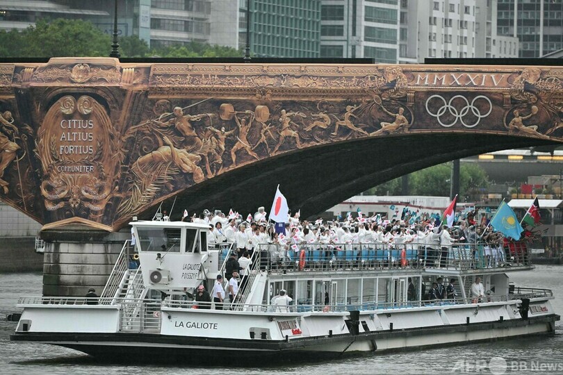 【7月27日 AFP】パリ五輪の開会式が26日に行われ、日本選手団がセーヌ(Seine)川で入場行進を行った。ブレイキン男子の半井重幸(Nakarai Shigeyuki)とフェンシング女子の江村美咲(Misaki Emura)が旗手を務めた。(c)AFP