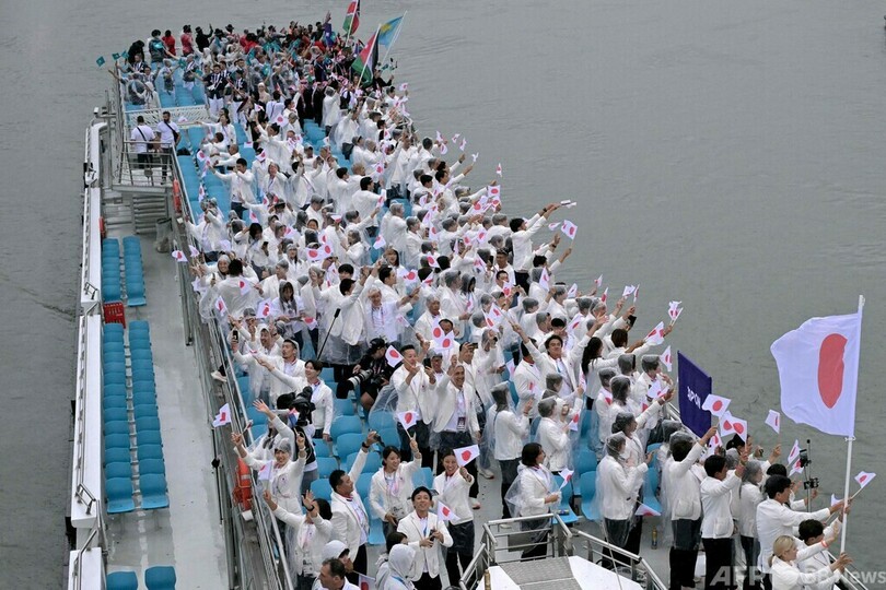 【7月27日 AFP】パリ五輪の開会式が26日に行われ、日本選手団がセーヌ(Seine)川で入場行進を行った。ブレイキン男子の半井重幸(Nakarai Shigeyuki)とフェンシング女子の江村美咲(Misaki Emura)が旗手を務めた。(c)AFP